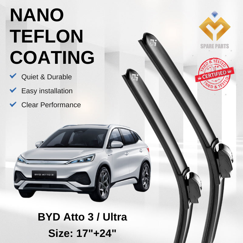 BYD Atto 3 / Ultra Premium Japan Tech Car Wiper 17”+24” Type 01 Clip, Free Microfibre Cleaning Cloth